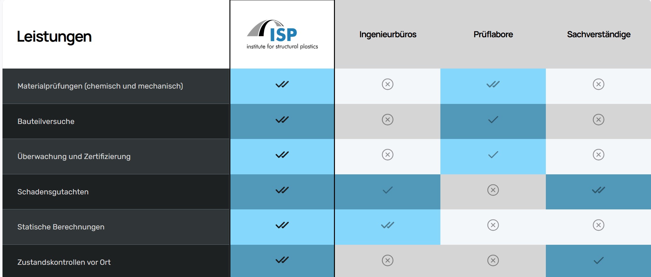 Die ISP Institut für tragende Kunststoffkonstruktionen GmbH ist ein unabhängiger Prüf- und Ingenieurdienstleister, der mithilfe moderner Analysen, Prüfungen und Zertifizierungsprozesse die Standsicherheit, Dauerhaftigkeit und regulatorische Konformität von Kunststoff-Baukonstruktionen sicherstellt – von der Produktentwicklung über Prüfung und Simulation bis zur offiziellen Zulassung und Schadensanalyse.